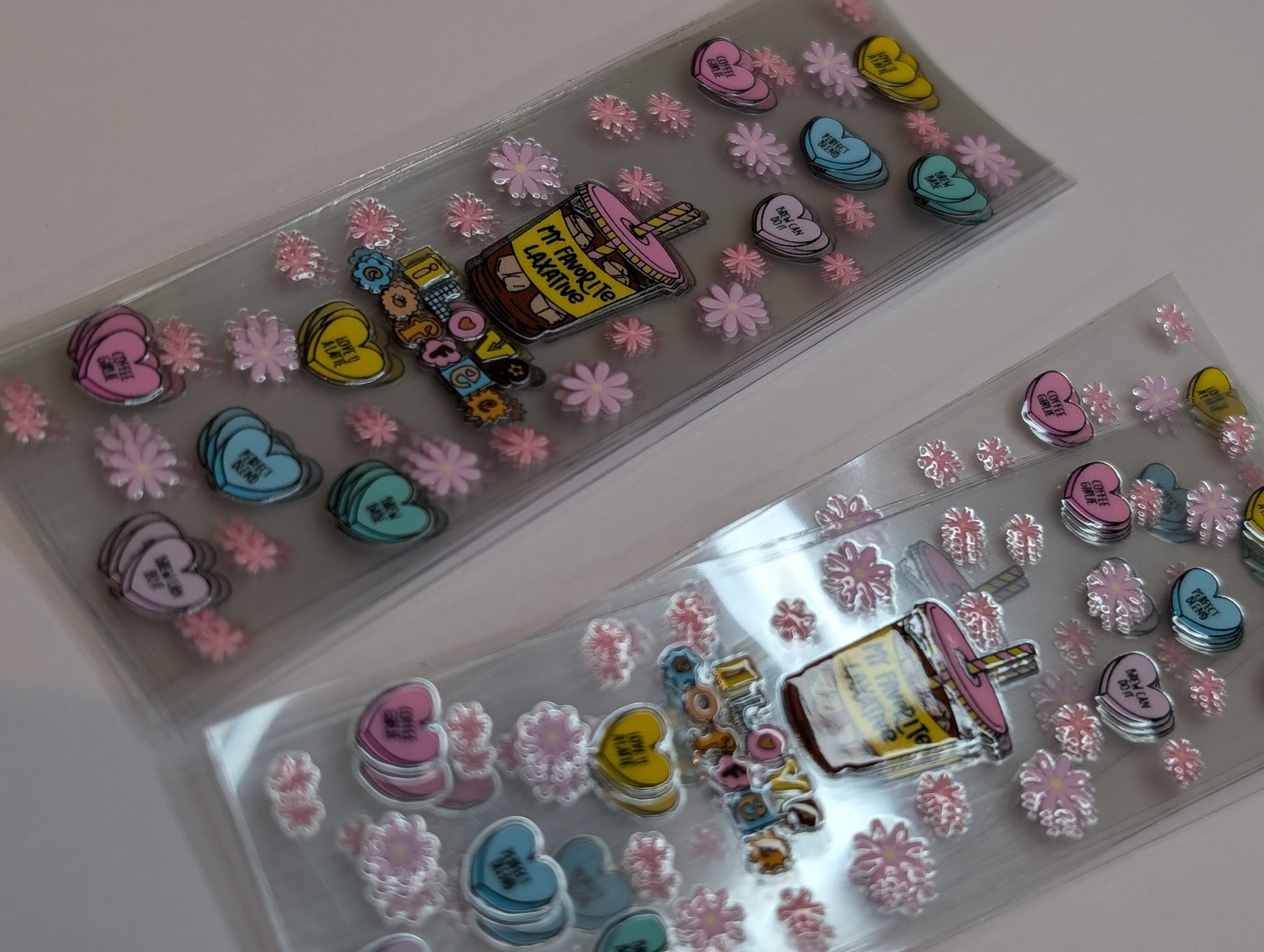 - Line the design film on the glass/plastic cup and lay design film down. Uvdtf is not forgiving so you will only get 1 attempt so take your time!